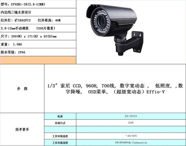 >> CP92B1-ir(2.8-12MM)红外摄像机